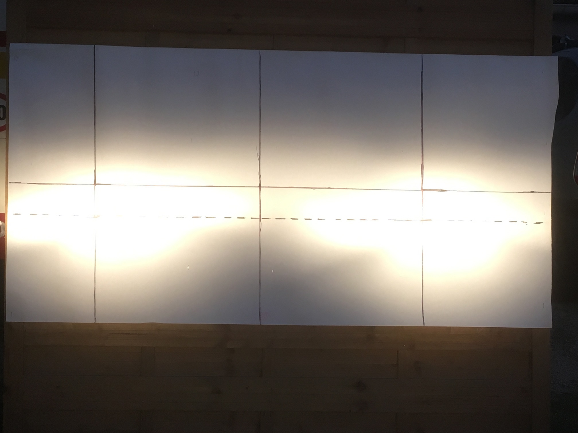 J'ai fait pareil, sur la photo 2 on voit les marquages les "L" sont les centres des optiques ( vertical+ horizontal = L), puis l'axe vertical entre les phares, le niveau, (les 2 reperes horizontaux du dessous marquent les 10 cm).