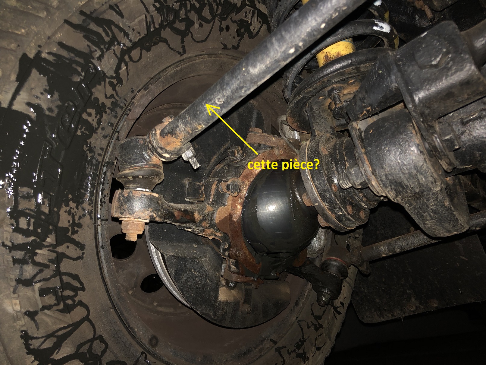 Nouvel élément que j'ai remarqué ce matin le pneu droit a frotté sur la grosse pièce qui va du chassis à l'essieu (voir photo ci-dessous):