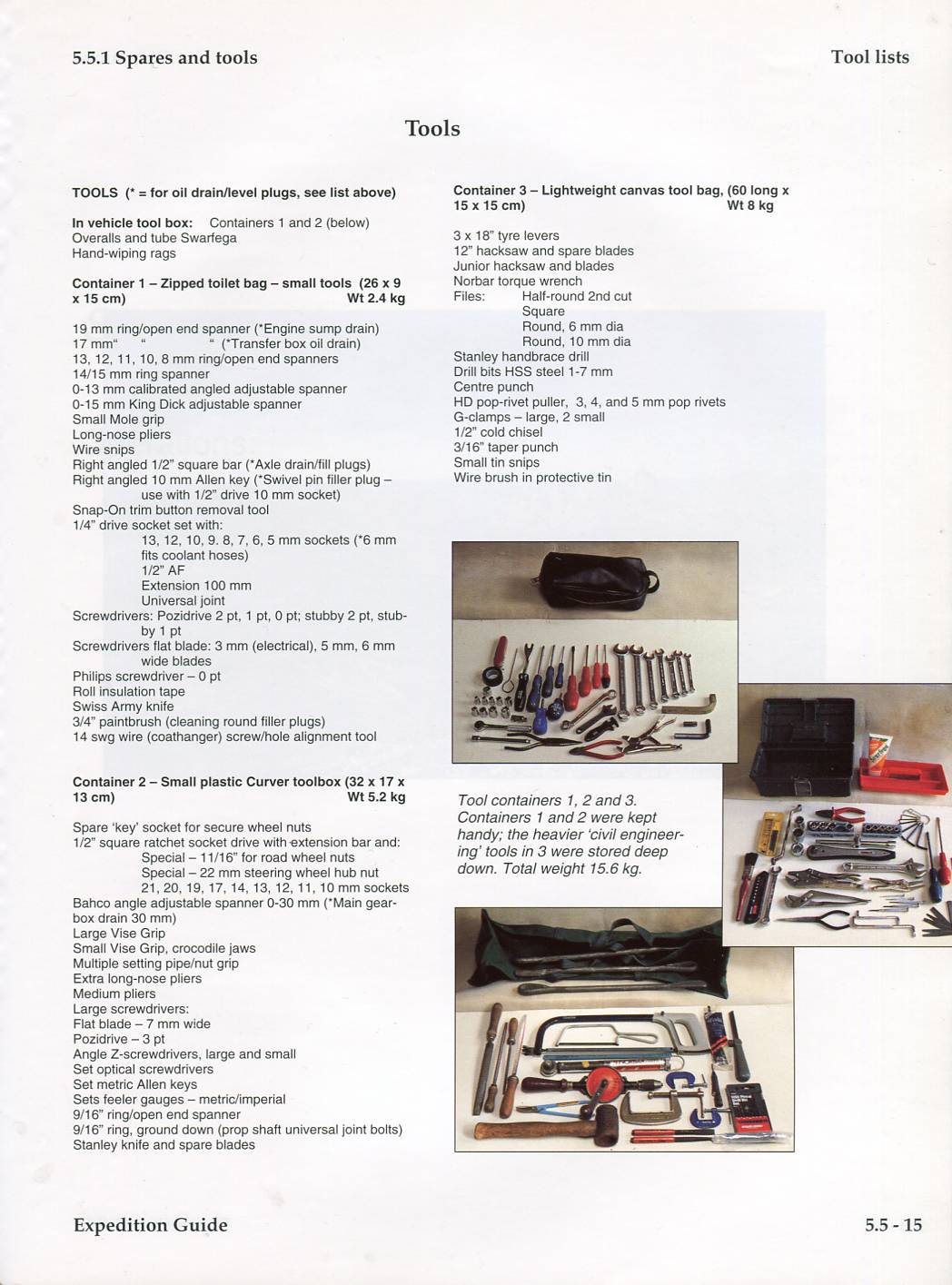 Voilà voilà.The Pater a écrit : Dans le livre de Tom Sheppard "Vehicle dependent Expedition guide", il y a un exemple de pièces détachées et outils à prendre pour un Defender 90 300 Tdi pour un raid (équipement pouvant supporterun groupe de 3 véhicules : on ne part pas en raid seul.....comme on peut le faire pour un tour de monde en touriste). Il n'y a pas un seul roulement ou "tulipe" sur 60 kg de matos, hors cric de levage.