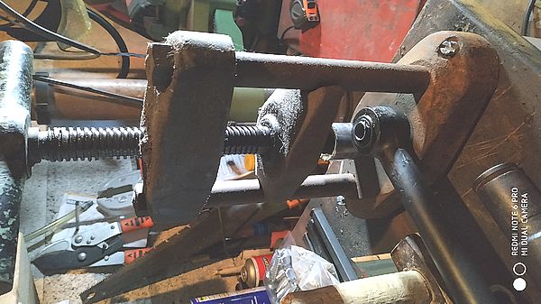 Après nettoyage et peinture emmanchement de la rotule neuve avec deux tiges filetées permettant la bonne orientation de la rotule :