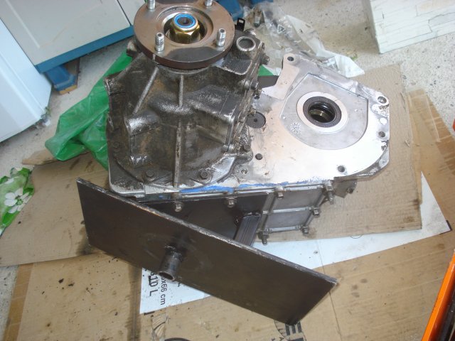 Certain le fond avec un gros cric rouleur sur lequel est solidement fixé une plaque en bois épaisse et évidée aux formes de l'ensemble BV-BT.