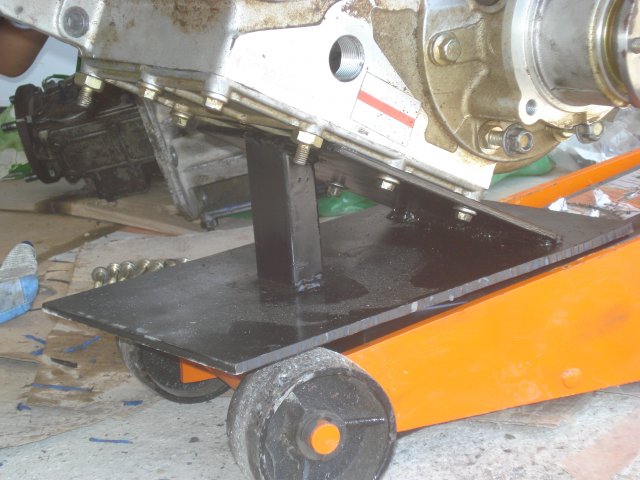Certain le fond avec un gros cric rouleur sur lequel est solidement fixé une plaque en bois épaisse et évidée aux formes de l'ensemble BV-BT.