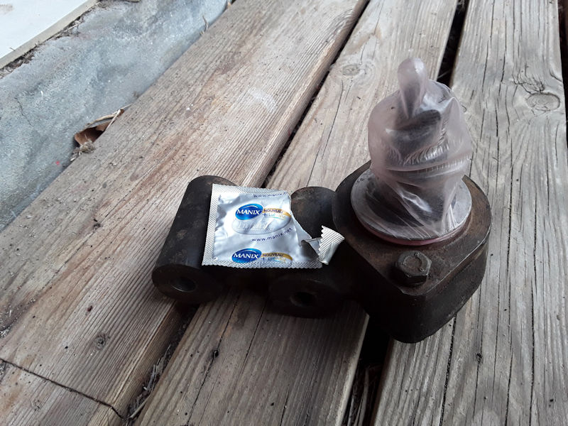 Le soufflet était déchiré mais encore bien chargé en graisse. La rotule ne présente pas de jeu ni de point dur. Je vais donc la restaurer et lui trouver un soufflet neuf si possible. Je n'en ai pas vu sur les sites spécialisés, uniquement la rotule avec son soufflet. (14€) Je dois protéger la rotule avant sablage. Cette accessoire m'a bien rendu service.