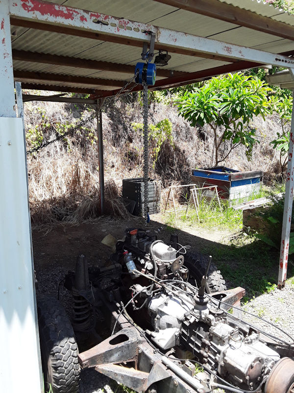 Je n'ai pas de palonnier, j'en fabrique donc un rapidement. Je fabrique également une sorte de chape pour fixer le palan à mon abris sur la fameuse poutre. J'aligne au mieux le Land sous mon installation. La visserie de la BV est retirée, je commence le levage. Quelques mouvement de monter descente et de branlage du moteur et la boîte se désacouple facilement sans forcer. Je recule le Land. Il n'y a plus qu'à déposer le moteur sur une palette. Je fabrique des pièces en bois à partir de cube de palette que je fixe sur les supports moteur à la place des silent-blocs. Le moteur est ainsi en équilibre. Rien que de traîner le moteur sur la terrasse demande beaucoup d'efforts quand on est seul. Je me la suis jouée à l'égyptienne avec des palettes, des tubes de parasol des cordes et le palan. Bref, j'ai mis autant de temps à le sortir du châssis qu'à l'amener sur la terrasse. à suivre...