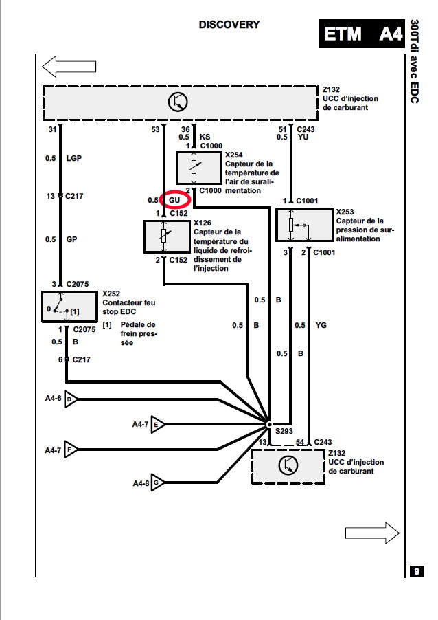 Pour les couleurs, cela figure sur les légendes des "86" la première lettre, c'est la couleur principale et la deuxième le liserè. Land est fidèle dans l'association des couleurs avec une fonction, exemple: Pour le capteur de température, le fil est repéré GU c'est à dire: vert liseré bleu. Une traduction pour les couleurs : Schéma TD du "86" ou la température est bien GU aussi : Légende TD identifiable car de base, il y a 110 éléments sur la liste des légendes: La fidélité des couleurs chez land... Où même sur les disco 300 le fil du capteur de température de liquide de refroidissement est GU : Sinon, même pour certaine partie du faisceau tu peux te référer aux schémas numérisés (pdf) du 300 tdi. Où tu peux voir que là aussi la couleur GU du fil du capteur de température est toujours la même