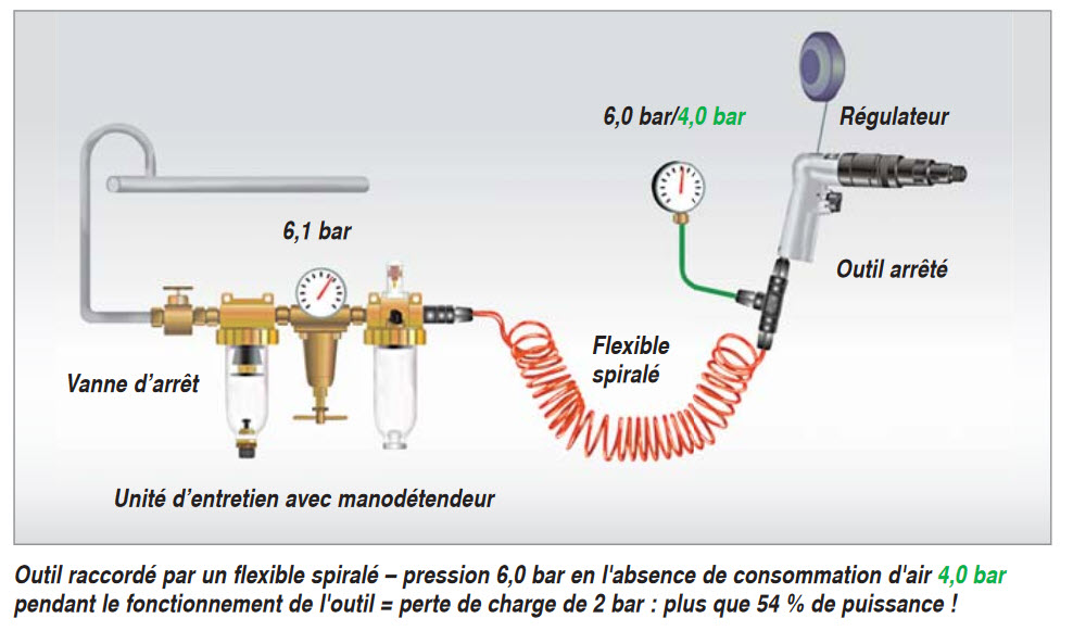 L’outil est relié au compresseur avec un ou des tuyaux. De plus si l’on voulait faire cela dans les règles de l’art on peut ajouter entre l’outil et le compresseur un déshumidificateur d’air (décanteur) et un huileur. Donc il y a des pertes de charges. La pression au niveau de l’outil est moindre que la pression en sortie de compresseur lors du fonctionnement de l’outil.