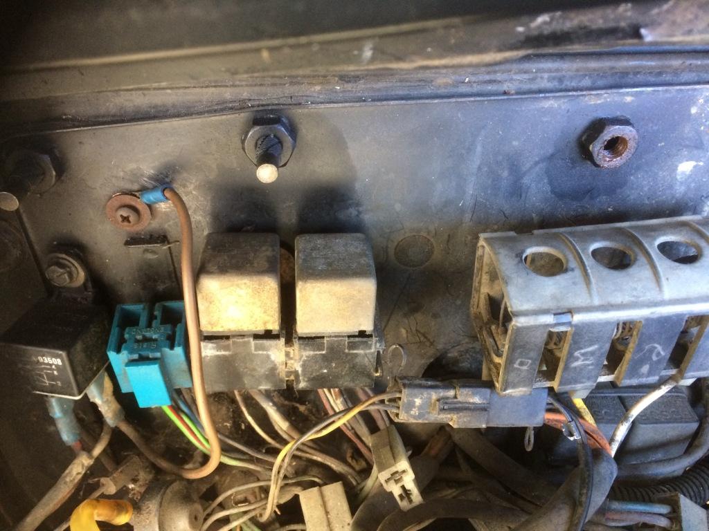Jette également un oeil aux fils qui partent de ton relais. Juste à côté, on voit qu'il manque un relais d'origine? peut-être que le support était abimé, et un ancien proprio aura tiré des fils pour utiliser ce relais récupéré à la casse ?