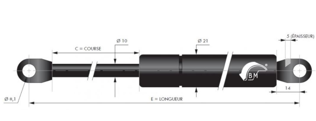 Diamètre : 10 mm Course : 400 mm Longueur : 885 mm Force 200 à 300 en Newtons