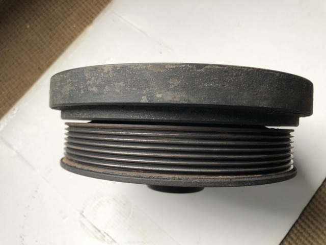 Une première planche sur laquelle on voit le moyeu, serré en bout de vilebrequin, et ses trois rayons. L'ensemble constitue la poulie d'entraînement de la courroie d'accessoires et est entièrement solidaire de l'arbre moteur.