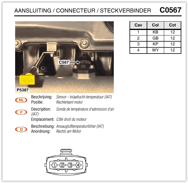 Le connecteur du capteur est le C0567.Sur la sortie 2 tu devrais avoir une tension qui varie de 0 à 5V plus l'air est chaud.