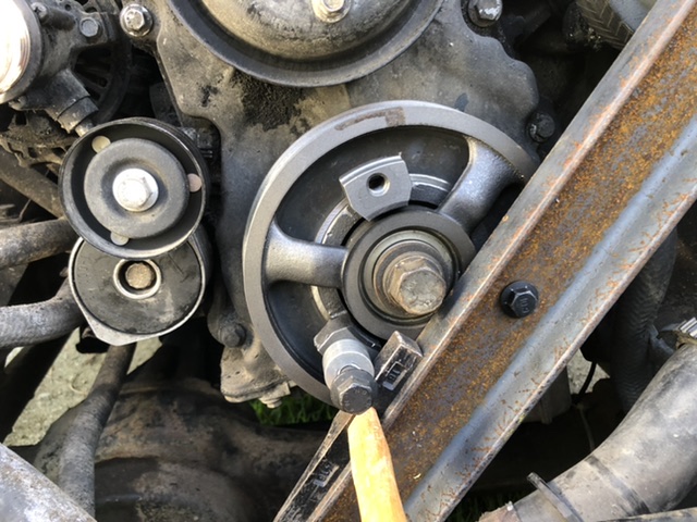 Une première planche sur laquelle on voit le moyeu, serré en bout de vilebrequin, et ses trois rayons. L'ensemble constitue la poulie d'entraînement de la courroie d'accessoires et est entièrement solidaire de l'arbre moteur.