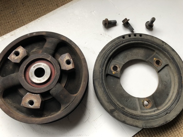 Une première planche sur laquelle on voit le moyeu, serré en bout de vilebrequin, et ses trois rayons. L'ensemble constitue la poulie d'entraînement de la courroie d'accessoires et est entièrement solidaire de l'arbre moteur.