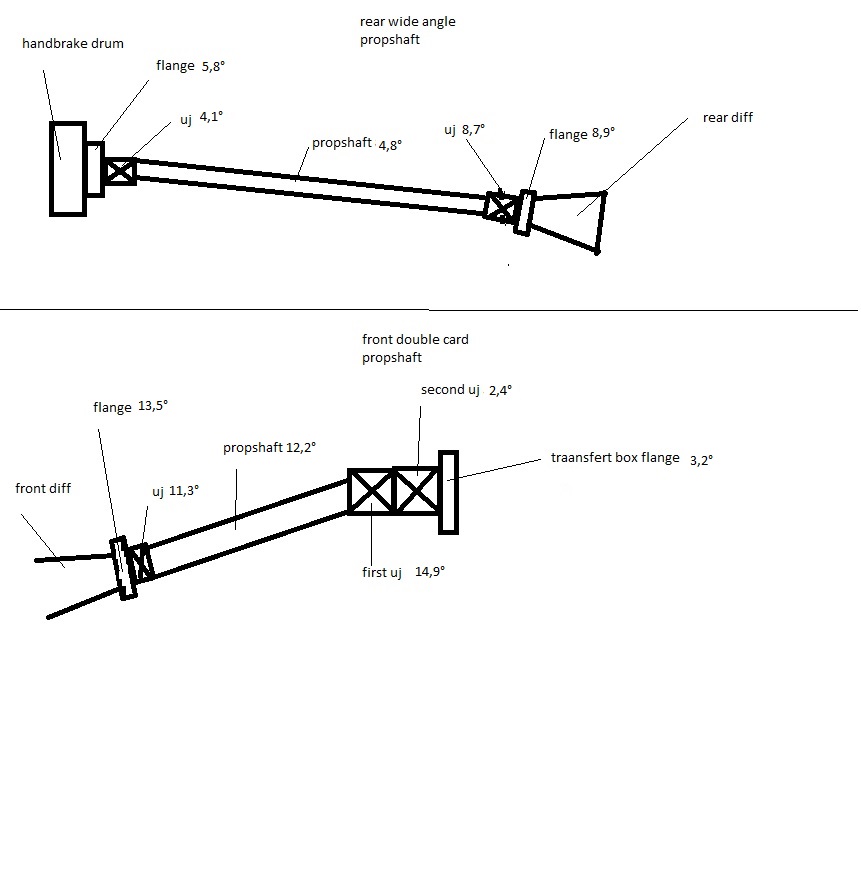 ah oui tu as raison je viens de vérifier. J'ai vu que c'est l'arbre avant qui a un décalage. Cela voudrait-il dire qu'il faudrait que je décale mon arbre avant double cardan et que je remette l'arbre arrière aligné? J'avais cru comprendre que les arbres avant double cardan devaient toujours être alignés. Je m'y perds un peu.