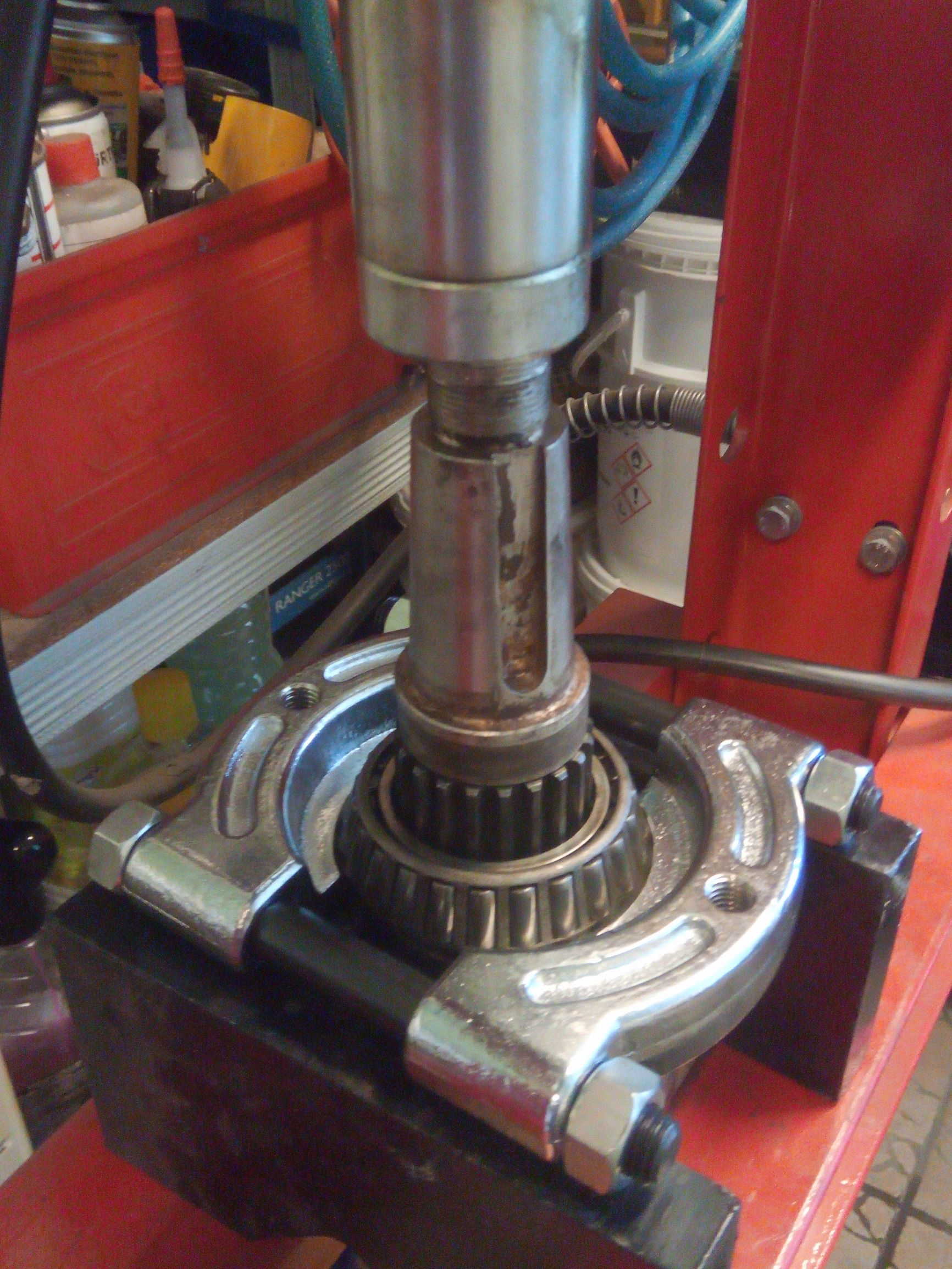 Je suis en train de confectionner quelques "outils" maison avec des éléments de "récup" pour pouvoir démonter et remonter les B.T.. Il ne me reste plus qu' a faire un montage le plus simple possible pour le réglage de l'intermédiaire. Là c'est pas gagné va falloir faire plusieurs tests. Coté démontage c'est tout bon , rien de bien sorcier . Je ne me casse même pas la tête à mettre une épingle + vérin (vis ou hydraulique) sur le décolle roulement , c'est direct à la presse avec le décolle roulement ça passe sans problème.