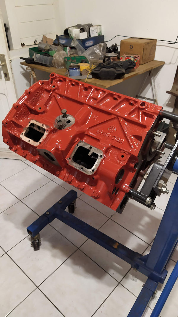 Peinture finie, Restom moteur, 3 couches. Pas pu choisir la couleur d'origine, pas en stock. Je passe donc du rouge brun à un rouge feu (dénomination Restom).