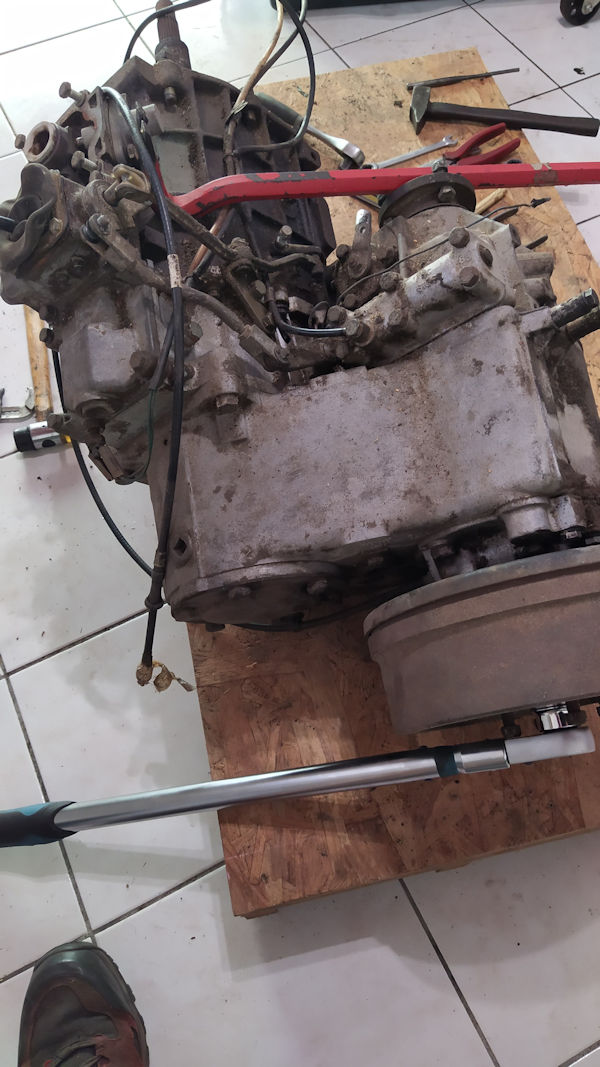 BT engagée, un pied de biche sur l'arbre de sortie avant et une longue clé à cliquet sur l'écrou de l'arbre de sortie arrière.