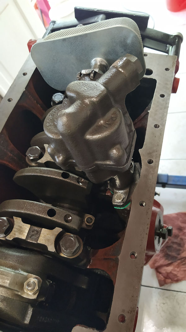 J'y suis allé en plusieurs passes pour finir à 108 N.m. Comme ça, même avec la plage d'erreur de la clé dynamo, je reste dans les clous sans problème. Dans la foulée, réglage des jeux de la rampe de culbuteurs à 0.25mm. Puis renversement du moteur et pose de la pompe à huile. Elle a été complétement nettoyée, révisée, joint neuf et serrage au couple de la visserie.