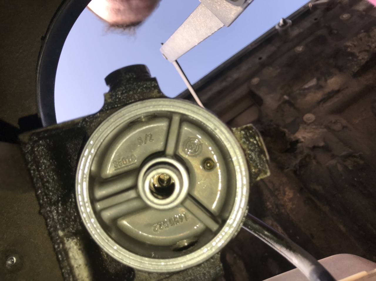 Sur l’ancien filtre en regardant par le trou du pas de vise on ne voyait pas le fond et là où j’ai entouré en rouge il y avait un large morceau de plastique blanc un peu comme sur le filtre Delphi le large joint noir