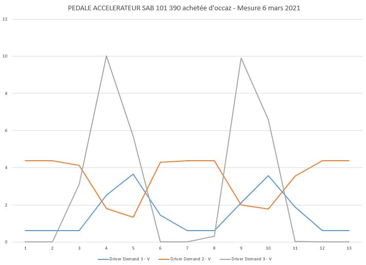 J'ai pu récupérer une autre pédale d'accélérateur sab101390, pour laquelle j'ai mesuré à nouveau les tensions ci-dessous avec mon icarsoft. Elle a le même comportement que celle d'origine. Je n'ai pas encore pris les mesures au multimètre mais je suis pratiquement certain que je trouverai pareil.