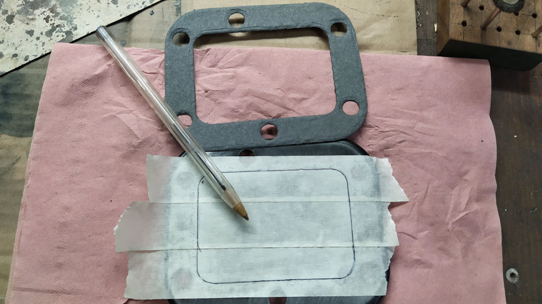Scotch de carrossier : Traçage de la forme du joint : Découpe à la forme du joint : La pâte à joint est uniquelment là où elle est nécessaire : Mise en place, même technique pour la plaque recevant la pompe à essence.