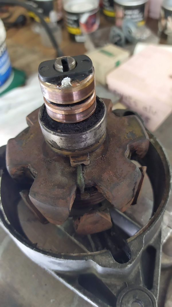 Dans son jus : Après un premier nettoyage rapide : Damned, il faut dessouder les collecteurs. Ca ne marche pas au fer à souder, pas assez de puissance. J'ai dû utiliser le chalumeau. Le reste sort assez facilement. L'usage d'une presse est nécessaire pour sortir les roulements proprement. Après un second nettoyage Il y a du monde quand même... Roulements et joint commandés, je les attends pour le remontage. Demain, je fini de tout nettoyer nickel.