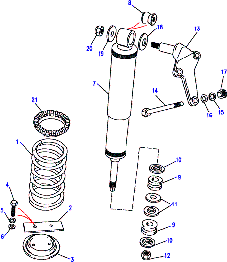 Une fois l'inversion des ressorts faite (les écarts de raideur peuvent faire du 2 à 3 mm sous charge de différence même si la hauteur à vide est pareille surtout avec des ressorts élaboré avec de l'acier à ferrer les ânes chinois....) on peut ensuite ajuster avec des anneaux ANR3060 (repère 21) :