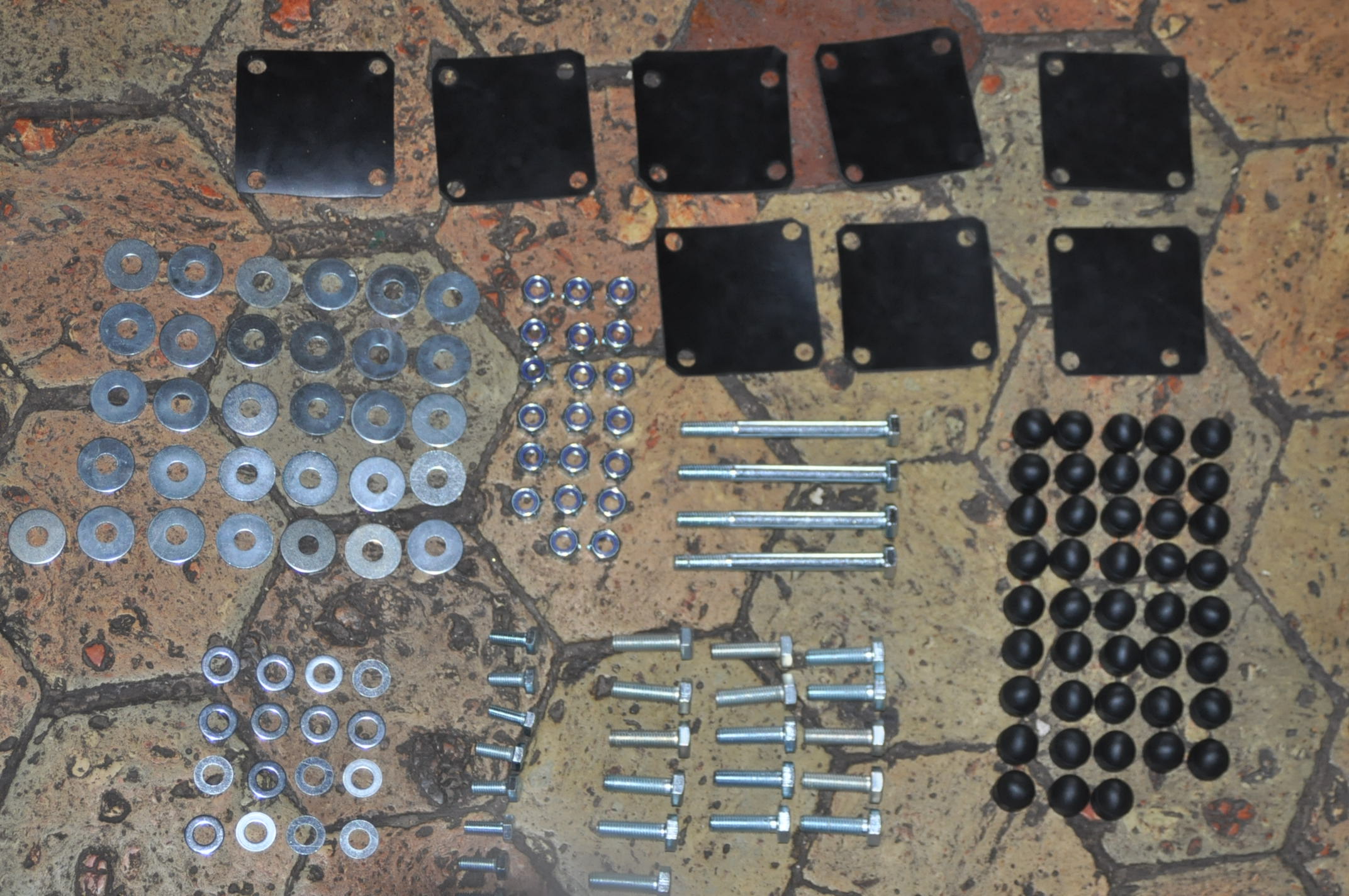 Visserie : La partie visible de l'iceberg, qu'il est préférable d'assembler avant en ne serrant pas les vis, puis de présenter ensuite l'ensemble pré monté sur le land afin d'ajuster les pattes puis de percer les trous de fixation. Les parties intérieur avant. La tôles de carrosserie est prises en pince : Cela nécessite une bonne dose de réflexion dans la chronologie des montages, des perçages et parfois une petite dose de persuasion : L'outillage : Les beug de conception ou de commande par rapport à l'année, ayant monté les renforts intérieurs latéraux apparu avec le 300, le mien étant de 1986, il a fallu adapter un peu pour le passage des renforts intérieur arrière, pour aller ensuite rejoindre le châssis... Des parties qui pourraient donner lieu à un quiz, lorsqu'on les déballe :