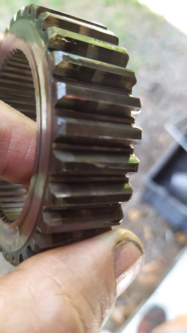 Première roue dentée. Denture hélicoïdale impeccable et denture pour le baladeur correcte. Quelques traces mais ça va refaire un tour.