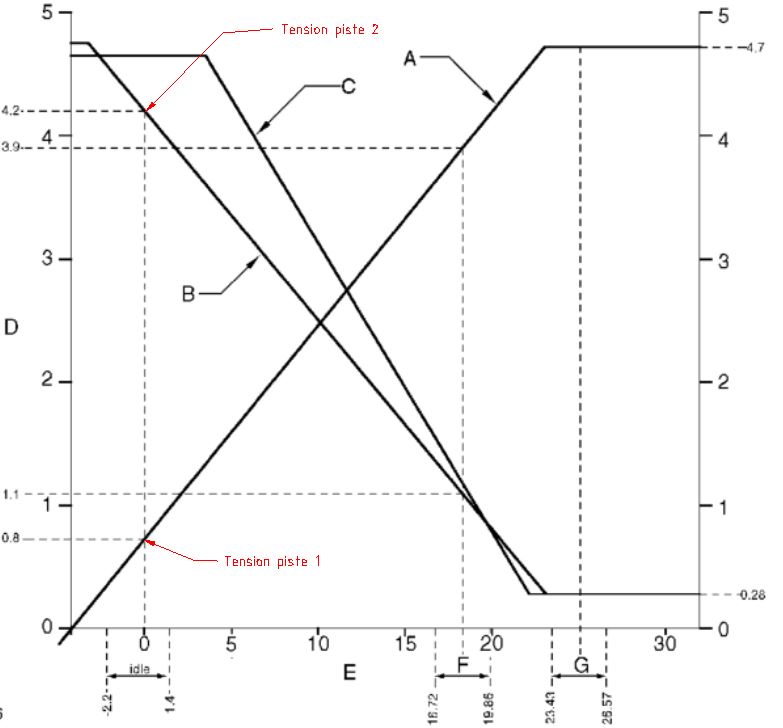 Si l'on étend cette logique à l'ensemble des tensions couvertes par les pistes croisées, la tension résultante est censée s'étendre de 0,8 V au ralenti (point 0 du graphe) à - 4,42 V à pleine ouverture (point G du graphe).
