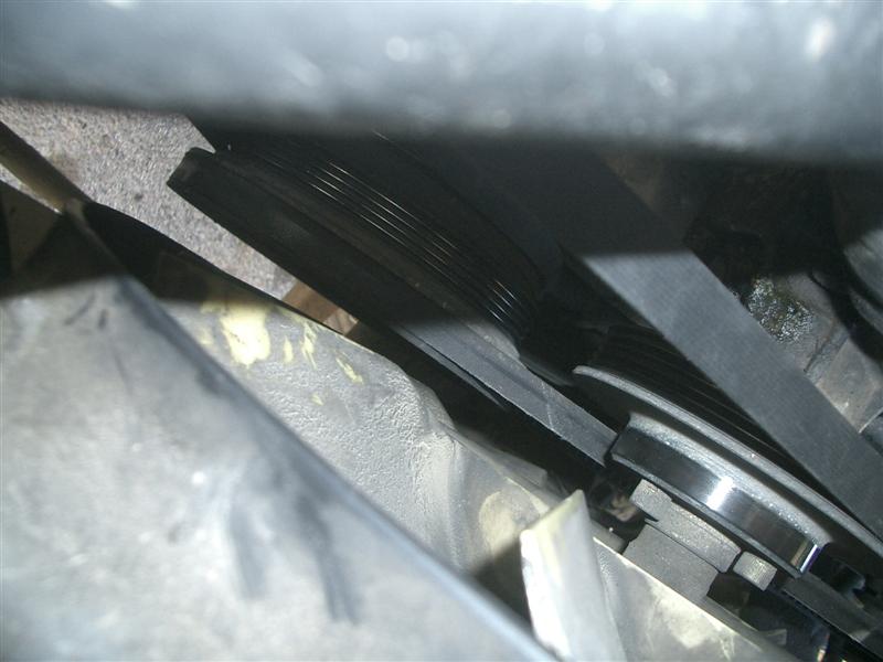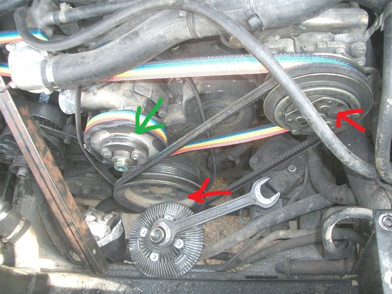 Je ne comprend pas bien, car chez moi l'alternateur est en dessous de la pompe à eau (cf flèche rouge) et celle ci est légèrement sur la gauche, le gros tuyau d’admission passe juste au dessus, je ne vois pas comment y fixer le visco-coupleur.
