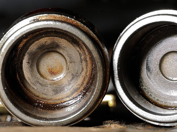 J'ai découvert que les fonds des cuvettes du croisillon ayant laché à 17500 km sont marqués. Le tourillon a frotté contre la cuvette. Le montage est trop serré, bien que je frappe les chapes pour faire remonter la cuvette contre le circlips. La cuvette la plus marquée correspond a celle du tourillon trés détérioré (je l'ai reconnu grace à la couleur et l'aspect caramélisé de la graisse, a gauche sur la photo). J'imagine, qu'en plus de la limaille produite, l'absence de jeu empêche le passage de graisse, le tout aboutisasnt à la destruction si rapide de l'ensemble. A titre de comparaison, une photo du croisillon d'origine, ouvert aprés 200mkm: On voit que l'usure du tourillon est quasi inexistante, que la graisse s'est correctement renouvelée, que le joint est une embase métallique, et surtout on distingue une rondelle avec un cone en fond de cuvette, en plastic, qui doit avoir un role non négligeable quant au probleme exposé au dessus.