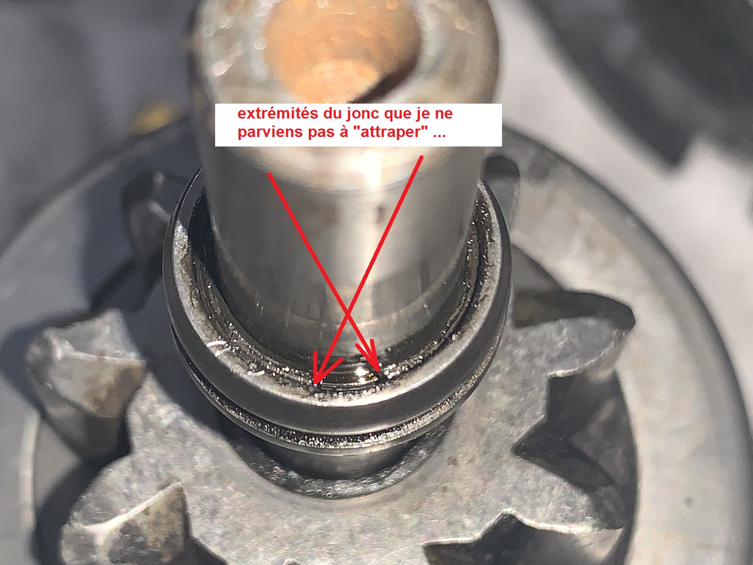 Je pense plutôt que c'est les logements des billes dans le lanceur du démarreur qui sont usées (système de roue libre). C'est le système anti retour du petit pignon d'entrainement de la couronne, ce qui permet de dégager le pignon de la couronne quand le moteur se lance car elle tourne beaucoup plus vite que le pignon du démarreur quand le moteur est démarrer.