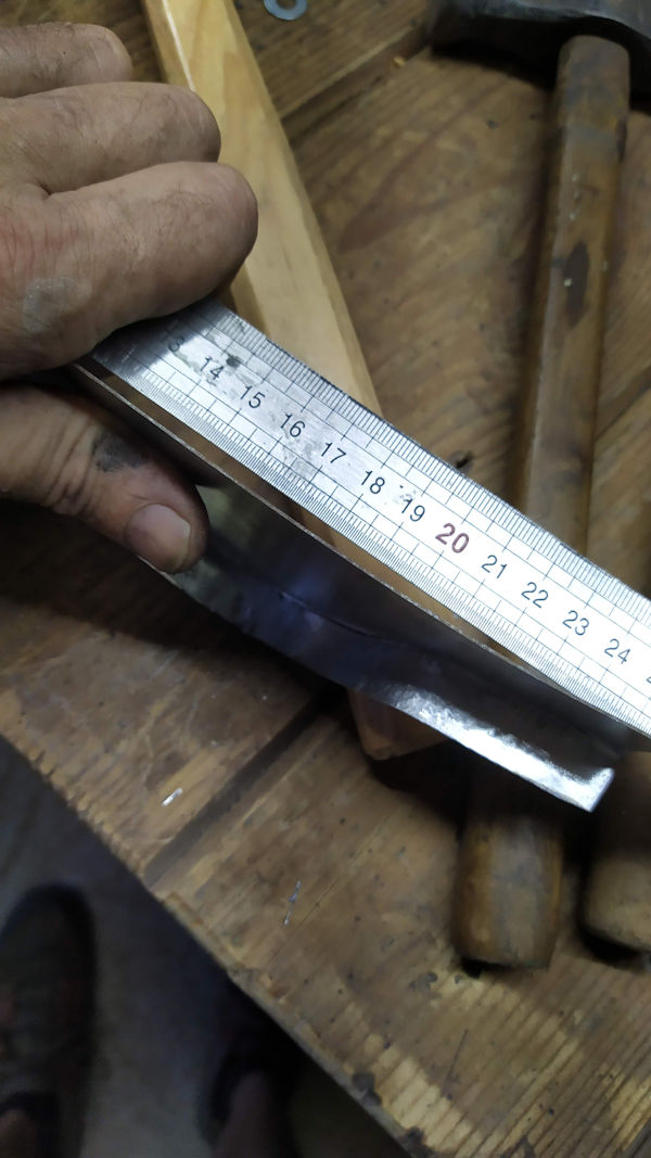 C'est pourri ! Gabarit relevé sur le tablier et découpe de deux morceaux de bois. Morceau de tôle du post précédent. Panoplie de marteaux et encore, il m'en manque pour certains cas de figure. Mise en forme : Le double pli était pas évident un coup en compression et un coup en allongement.