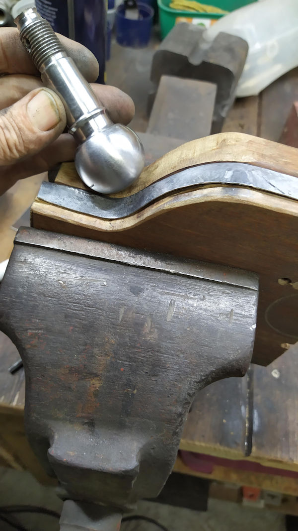 Je sors la plaque de la pince en bois et continue sur mon tas. J'arrive à faire le congé mais évidemment le plan principal se gauchit. J'arrive à rattraper en partie mon affaire Je replace la tôle dans la pince en bois, je sacrifie une rotule sur l'autel de la carrosserie et je m'en sors assez honorablement. La sphère de la rotule permet de bien aller étirer la tôle dans le creux du congé. Je me demande si je les laisse comme ça ou si je les monte en marteau. A voir... à suivre...