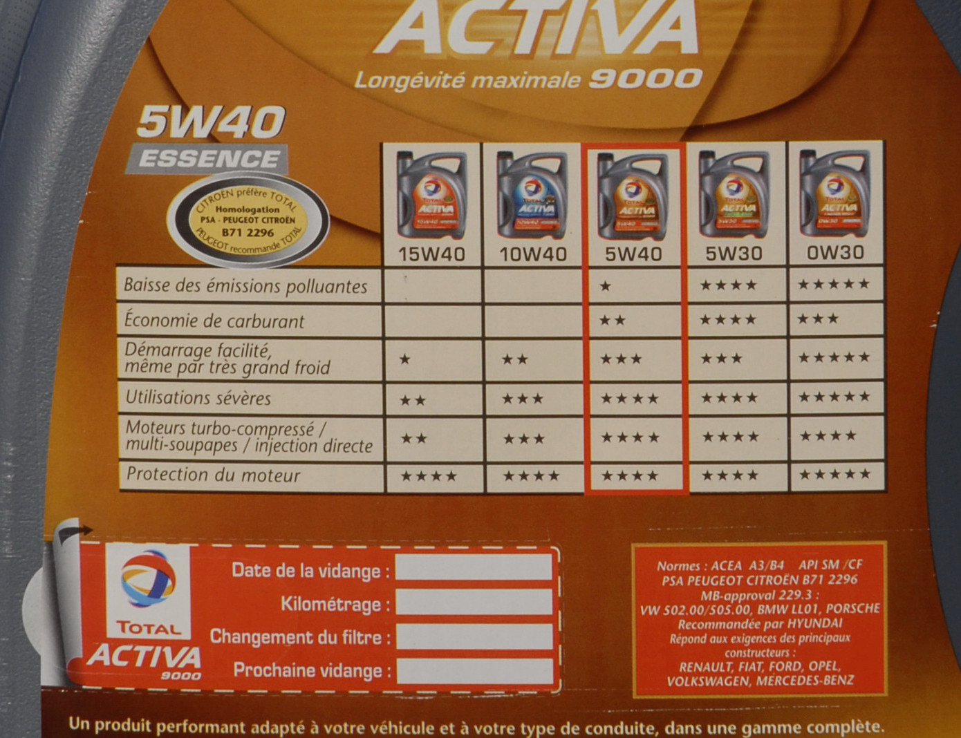 On pourra remarquer que l’huile 5W40 conviendra à pratiquement tous les moteurs automobiles pour une utilisation en France. Vérifiez quand même….