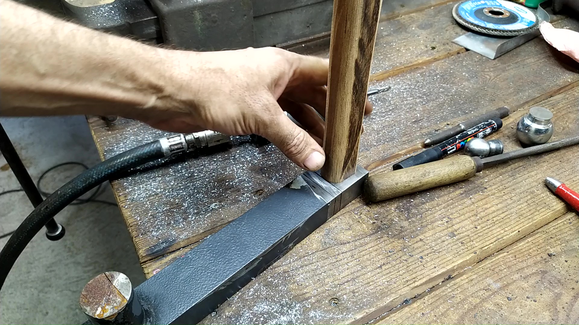 Trou oblong fait à la perceuse puis à la ponceuse droite pneumatique avec fraise cobalt. Présentation du manche : Rotules soudées sur la tête : Insertion du manche : Et voila : Pour faire des petits rayons : Ou des plus grands : Vidéo YouTube avec plus de détails : Vidéo ici sur ma chaîne