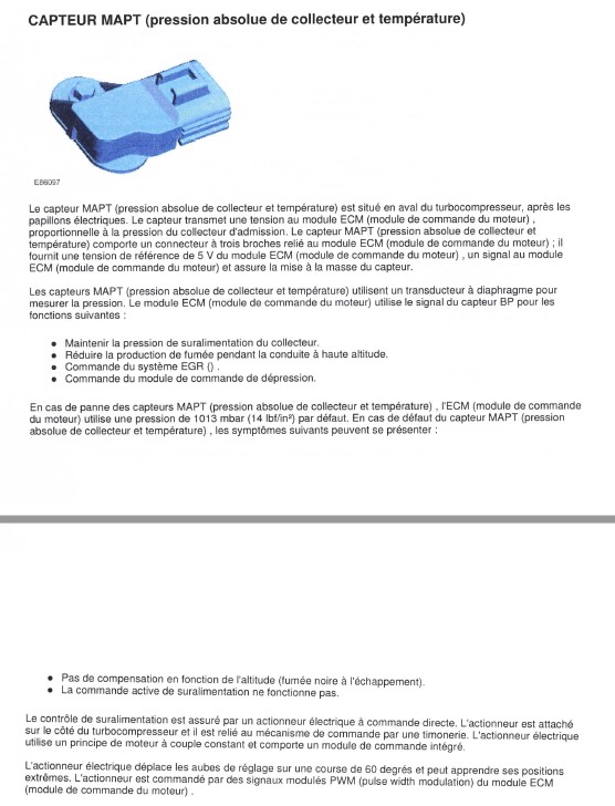 okThe Pater a écrit : 18/01/2022 10:09 Le manuel d'atelier du Td4 indique qu'une défaillance du capteur MAPT (pression absolue de collecteur et température) peut donner les symptômes suivants :