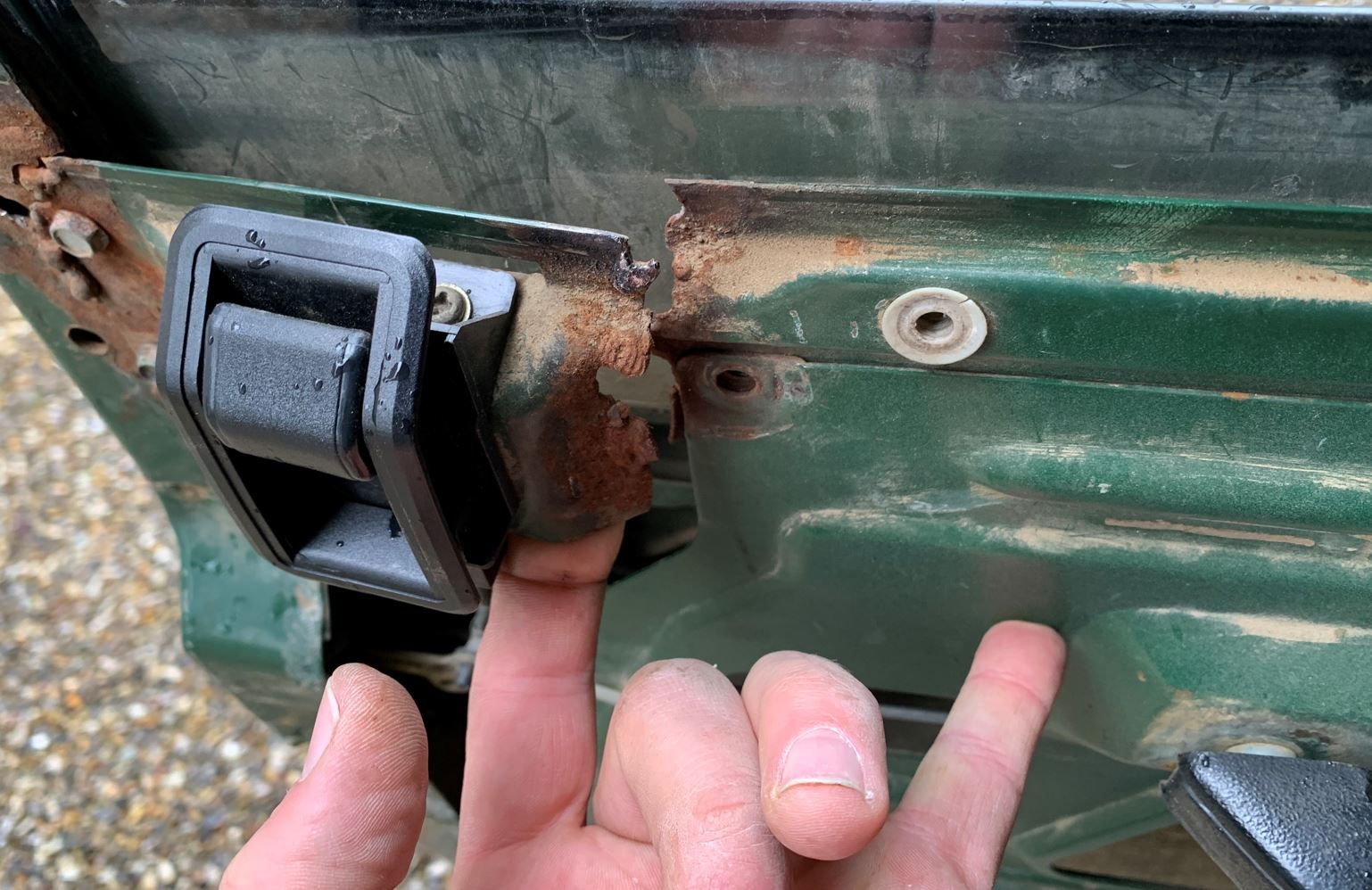 Ces parties intérieures cassent ou sont bouffées par la rouille passé un certain âge, et comme les panneaux de porte ne sont pas des habillages que l'on retire souvent. On dirait qu'il a déjà été soudé, mais pas traité contre la corrosion