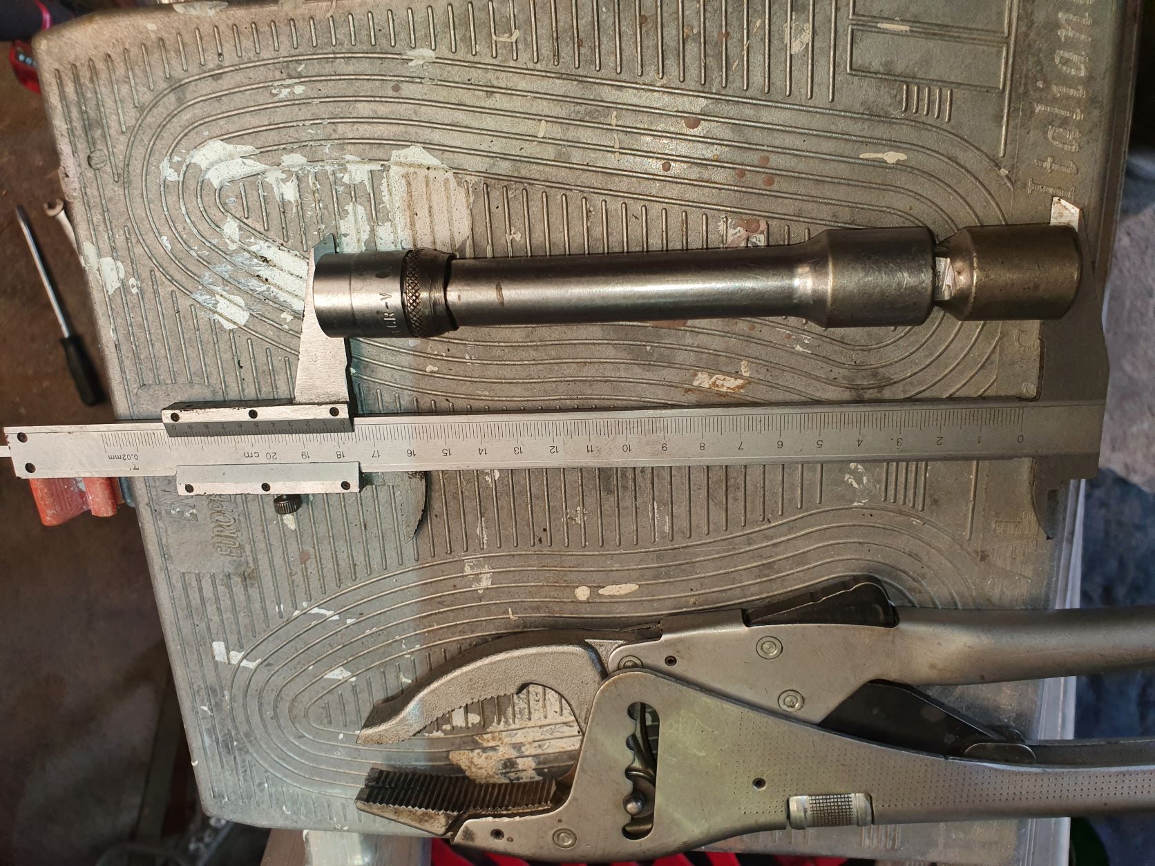 Puis c'est l'espace de travail une fois déposé la boite à air! franchement, pour avoir fait la même opération sur un Nissan Terrano c'est autre chose! Pour désaccoupler l'ensemble Cloche d'embrayage/BT/BV du moteur il faut déposer le démarreur qui est tenu par 2 vis de 13 et un boulon de 15. Ce boulon est difficile d'accès car il y a une bosse sur le corp du démarreur qui empêche la douille de bien l'enserrer. Alors j'ai acheté une douille dans une GSB que j'ai raccourci de l'avant tout en gardant suffisamment de matière pour bien saisir le boulon et je l'ai aussi affiné à l'arrière pour éviter cette fameuse bosse. Puis mes rallonges de douilles à dispo ne correspondant pas à la longueur nécessaire pour donné accès à la clé, j'en ai raccourci une "noname". Tout peut ce faire à la disqueuse. Enfin j'ai fabriqué un support cloche/bt/bv en me servant des points d'attaches disponibles: 1 M10 sur la cloche et 3 M8 sur la BT.