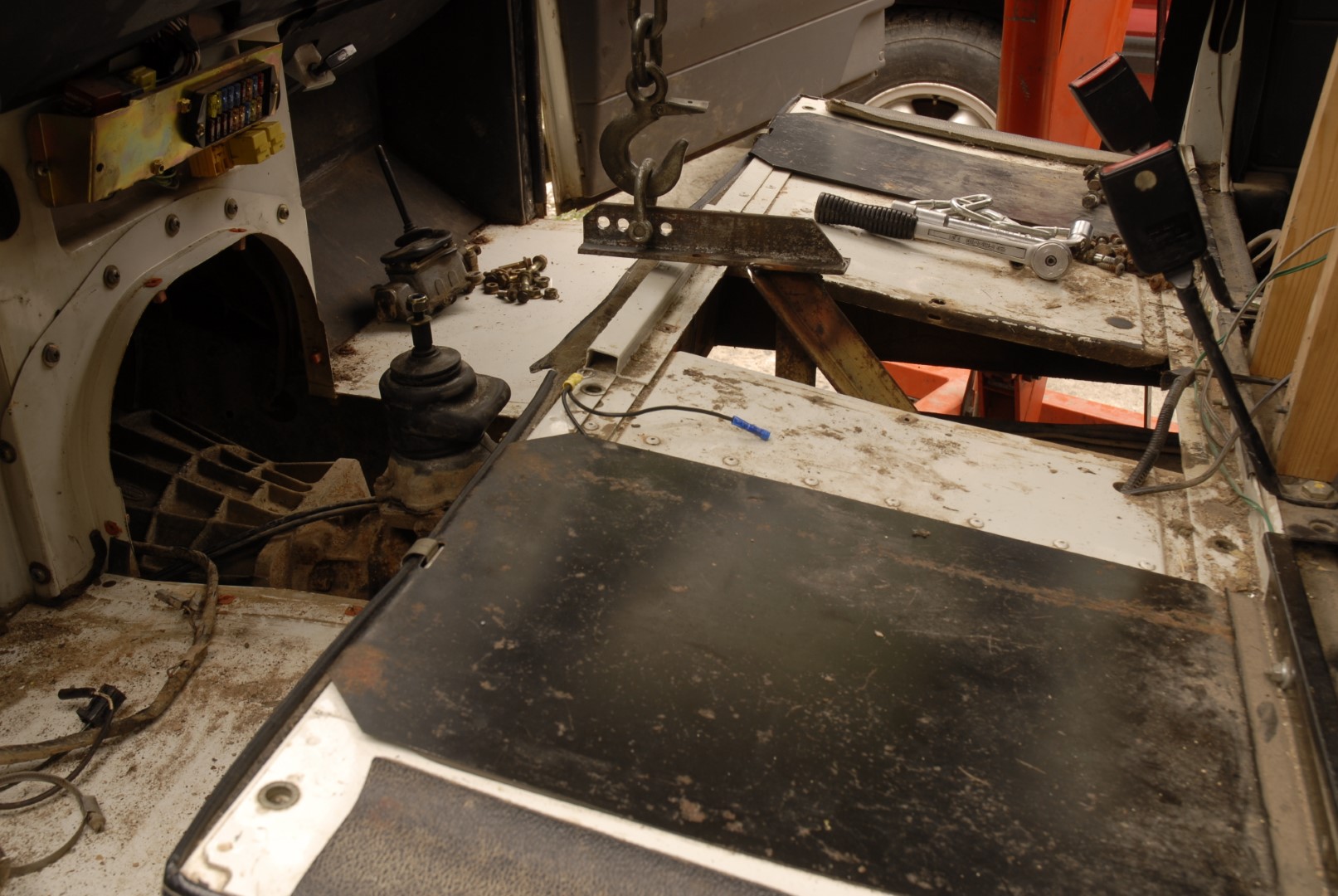 Pour la descente de la BT, j'ai tout fait seul et n'ayant pas de chèvre (super recette de kébir de tu as une chèvre !), j'avais viré le siège central pour passer un petit palan à chaine supporté par une poutre posée sur 2 tréteaux de maçon (après retrait des portières évidemment !). Ainsi, j'ai pu travailler seul et en sécurité.