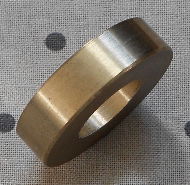 Voici la pièce d'usure en cupro-alliage, vue sous trois angles différents, étant entendu qu'il s'agit d'une pièce beaucoup plus épaisse (on avait usiné plusieurs ébauches en prévision d'autres interventions) que celles qui ont été montées sur les différentiels que nous avons reconstruits :