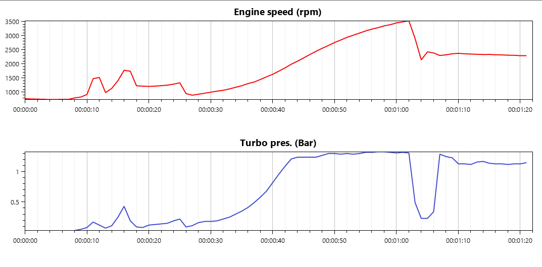 ci-joint 2 copies d'écran de l'enregistrement des data : pédale d'acélérateur appuyée à fond depuis 1000tr/min jusqu'à 3500tr/min (en 4ème)