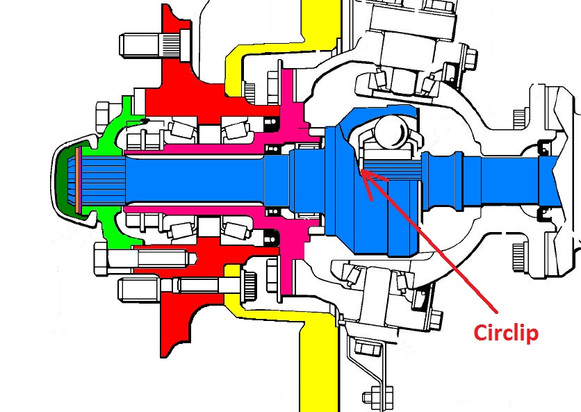 Par la suite ils ont ajouté un joint supplémentaire, dans le moyeu, coté roulement externe. L'huile provenant du pont ne pouvant plus se mélanger avec la graisse des roulements.