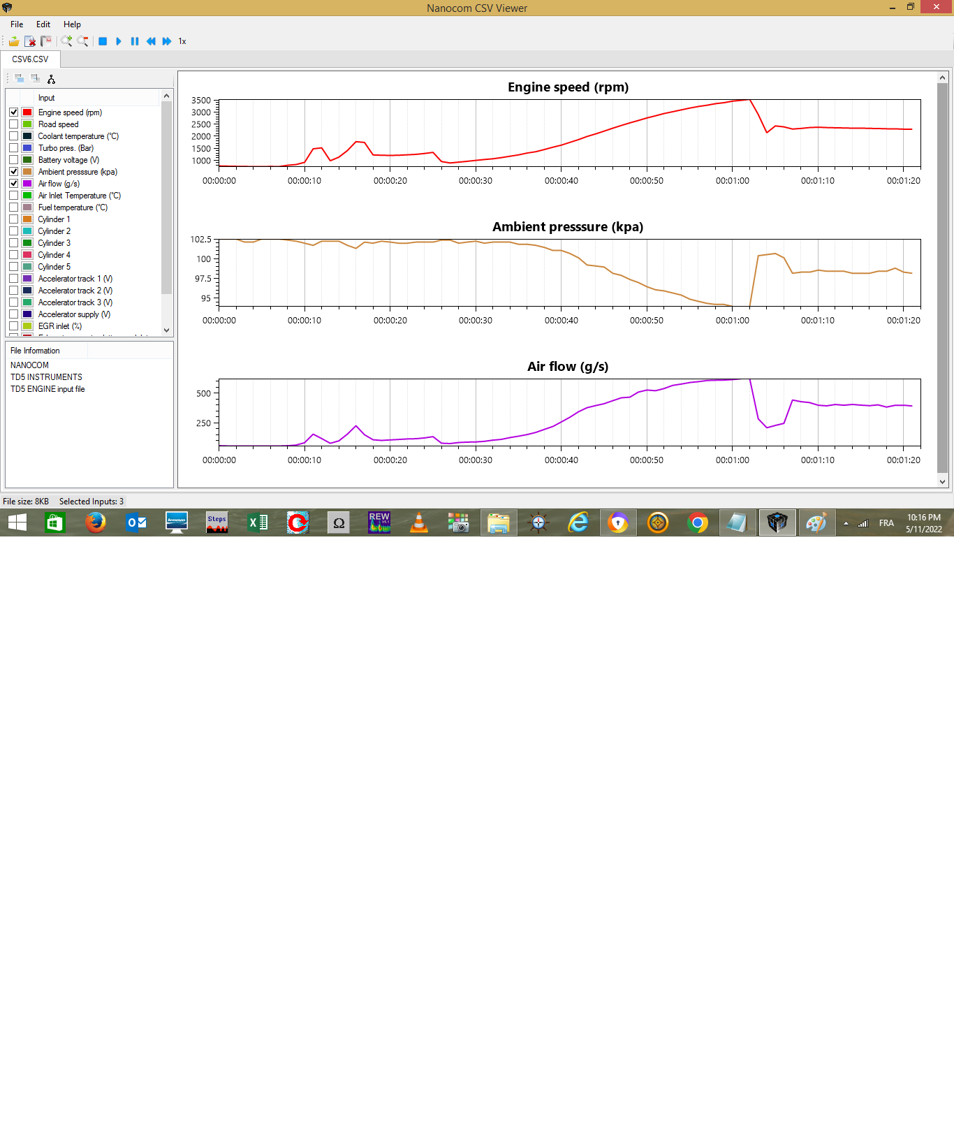 ci-joint 2 copies d'écran de l'enregistrement des data : pédale d'acélérateur appuyée à fond depuis 1000tr/min jusqu'à 3500tr/min (en 4ème)