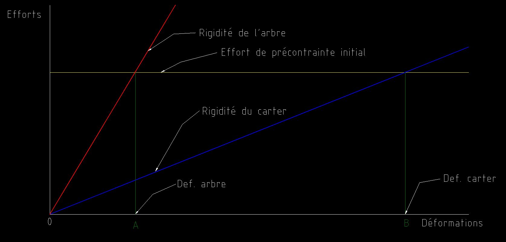 Par ailleurs, les efforts dans les arbres et ceux exercés en réaction par le carter sont de signes contraires, mais rigoureusement égaux. L’effort de précontrainte va donc provoquer un raccourcissement de l’arbre matérialisé par la distance OA et un allongement du carter représenté par OB.