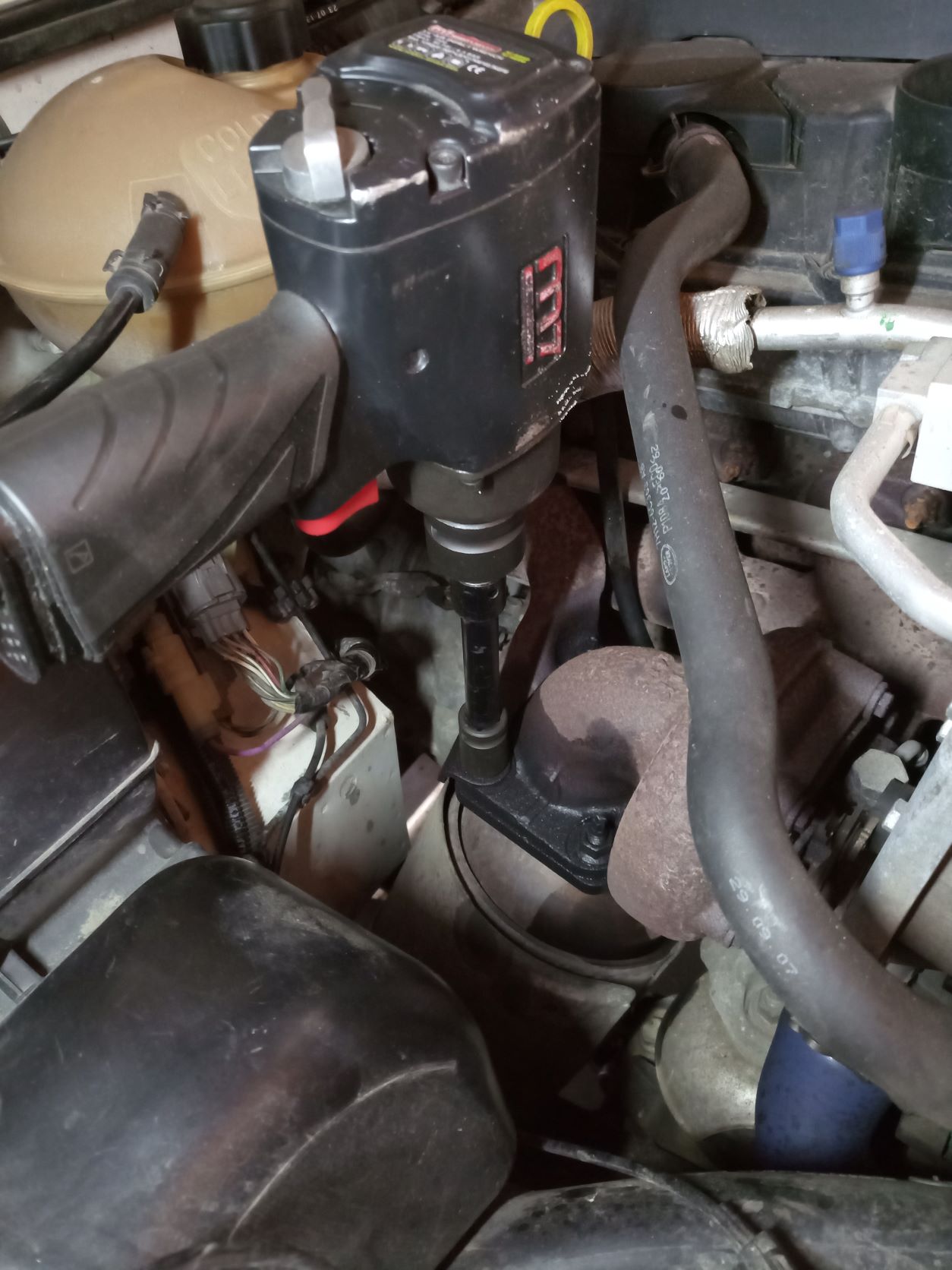 3) dévisser la bride de raccordement du turbo . Douille de 15 mm et rallonge , 4 écrou à enlever. Mettre du dégrippant et utilisez une clé pneumatique pour faciliter le dévissage.