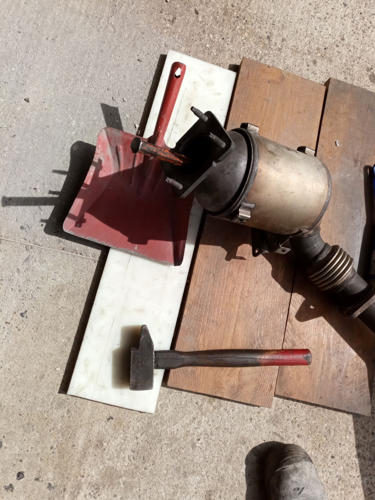 7) Les ennuis commencent , impossible de sortir le catalyseur , ça ne passe pas , la collerette de fixation basse du catalyseur bute contre la cloche d'embrayage. J'ai essayé dans tout les sens "nada" "wallou".