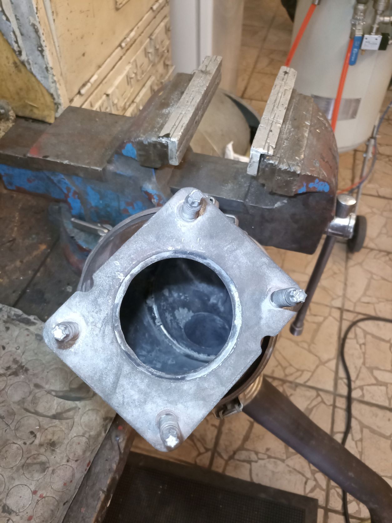 Au remontage j'ai modifié la bride ovale . J'ai viré les 2 goujons qui sont montés en force par cannelures , quelques coup de marteau et ils sautent. J'ai fraisé la bride ovale du pot catalytique pour y insérer des vis inox .