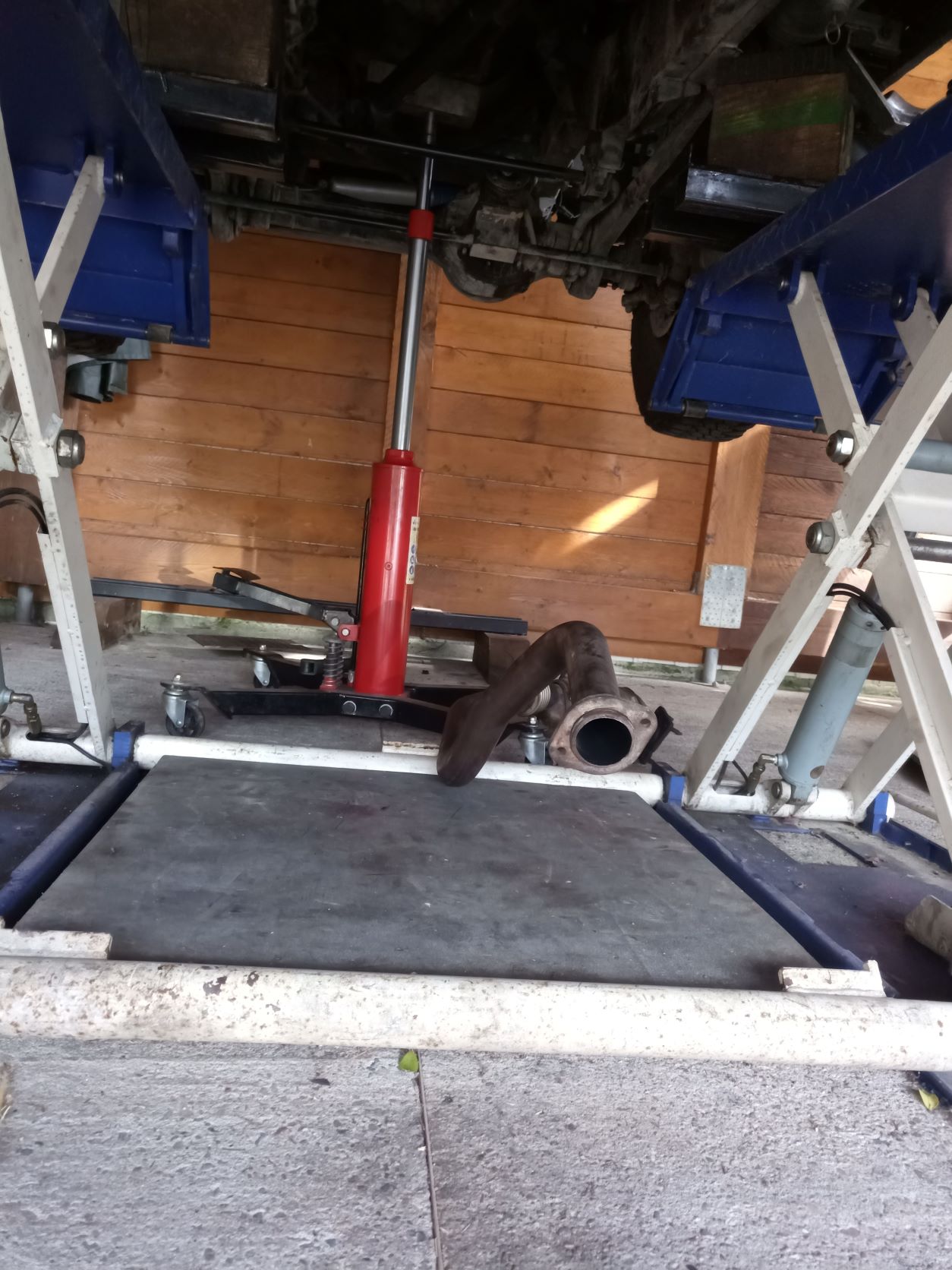 Soulever le véhicule pour travailler par dessous. L'idéal est un pont avec les roues du véhicule au sol . Moi j'ai travaillé roue pendantes car je n'ai pas le choix , c'est plus délicat lors du levage du moteur.