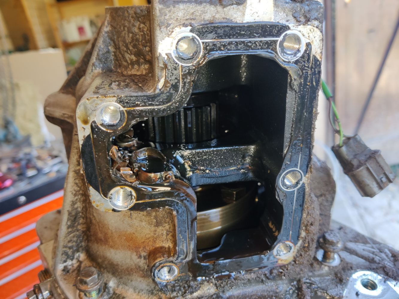 Un autre soucis est apparu, roulement de sortie avant sur la LT230 complétement détruit. Par miracle il n'y a pas de trace ailleurs, les vis du différentiel ont pris le temps de tout broyer. J'attends mes joints et roulements pour remonter l'ensemble. Aucune dent n'est marquée.